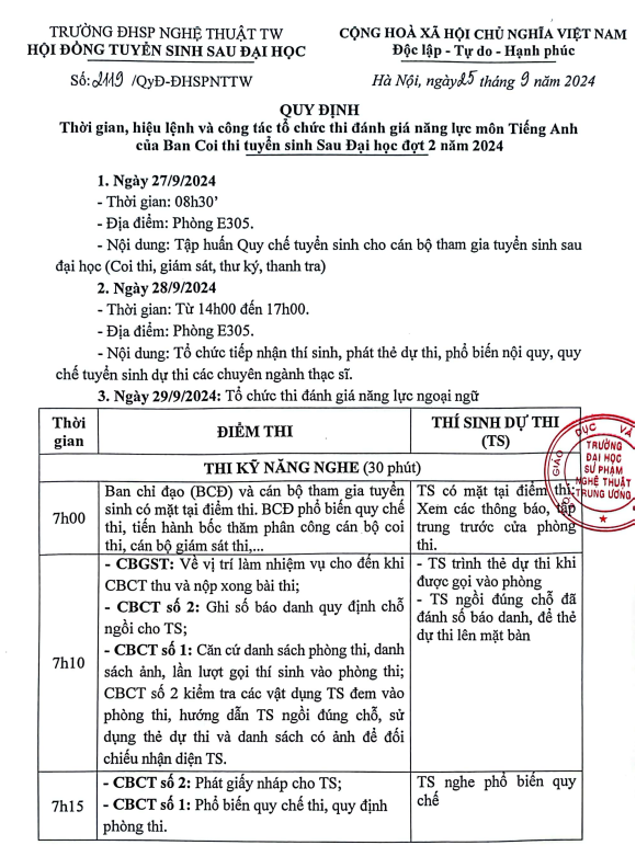 Quy định số: 2119/QyĐ-ĐHSPNTW, Ngày 25/9/2024 v/v Thời gian, hiệu lệnh và công tác tổ chức thi đánh giá năng lực Tiếng Anh