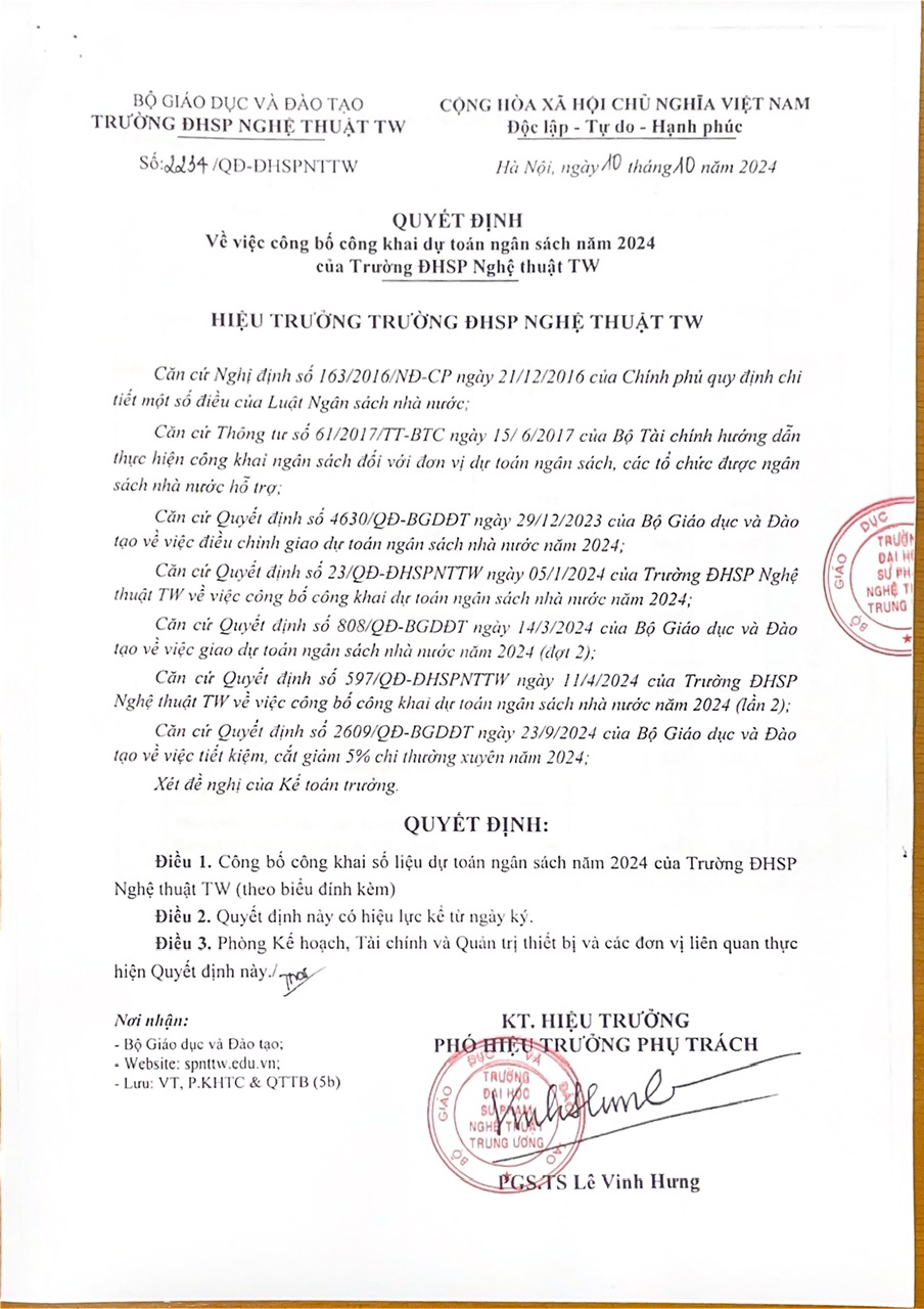 QUYẾT ĐỊNH Về việc công bố công khai dự toán ngân sách năm 2024 của Trường ĐHSP Nghệ thuật TW