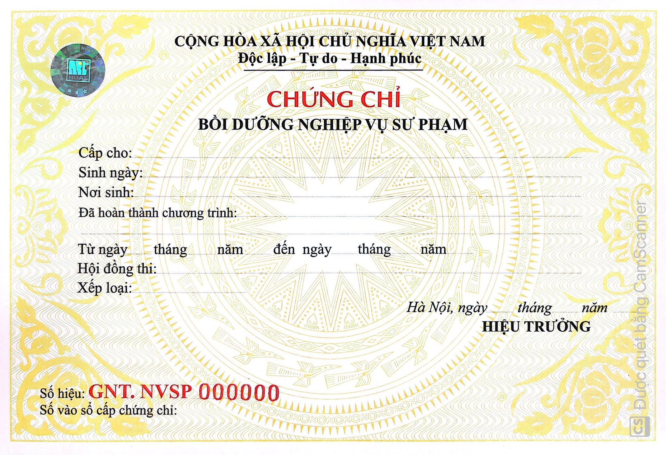 Mẫu phôi chứng chỉ Nghiệp vụ sư phạm