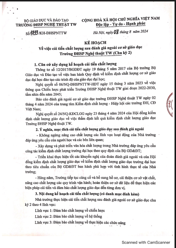 Kế hoạch cải tiến chất lượng sau đánh giá ngoài CSGD Trường ĐHSP Nghệ thuật TW (Chu kỳ 2)